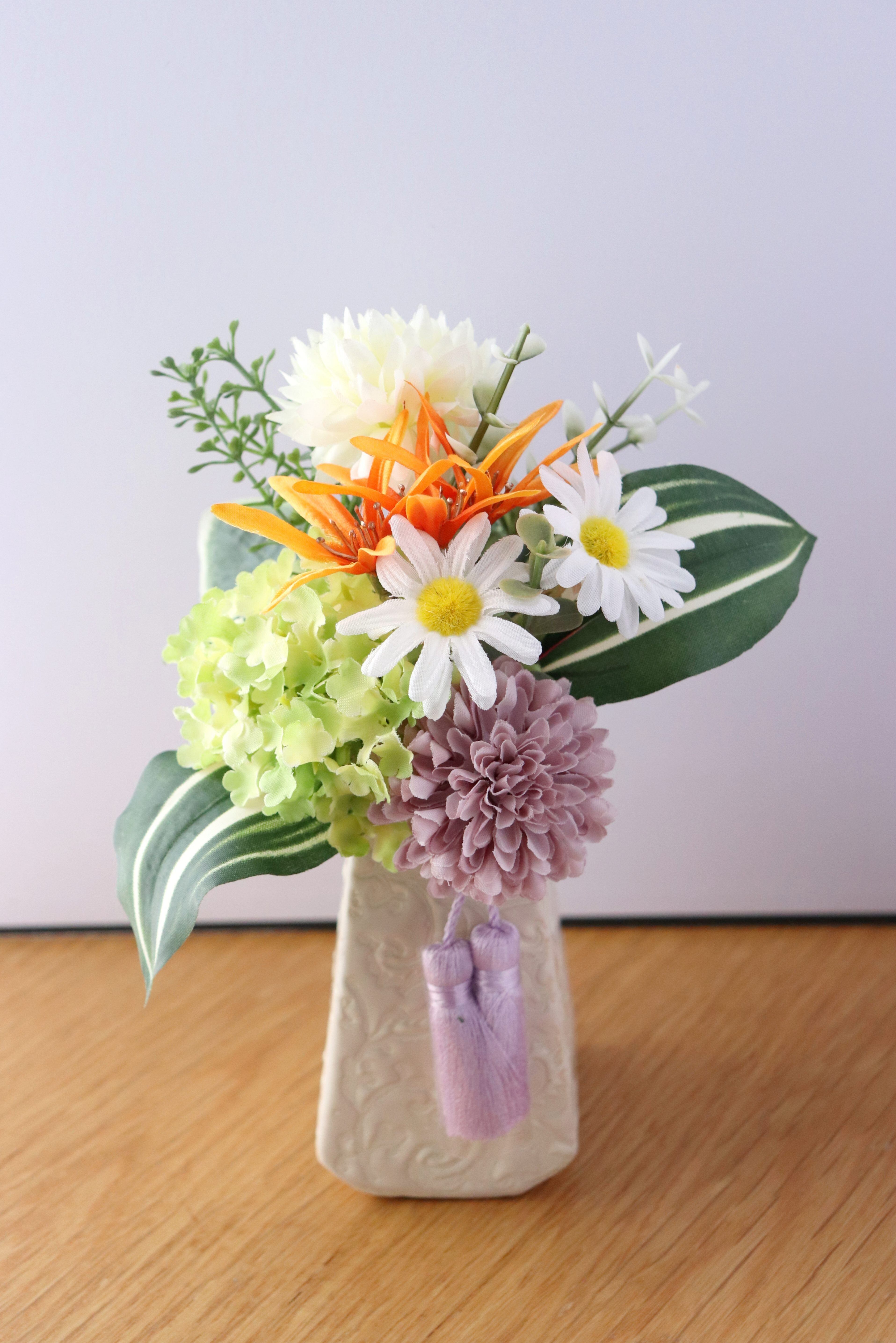 陶器の花器に添えた紫のタッセルが、静かな格式と供養の心に寄り添います。