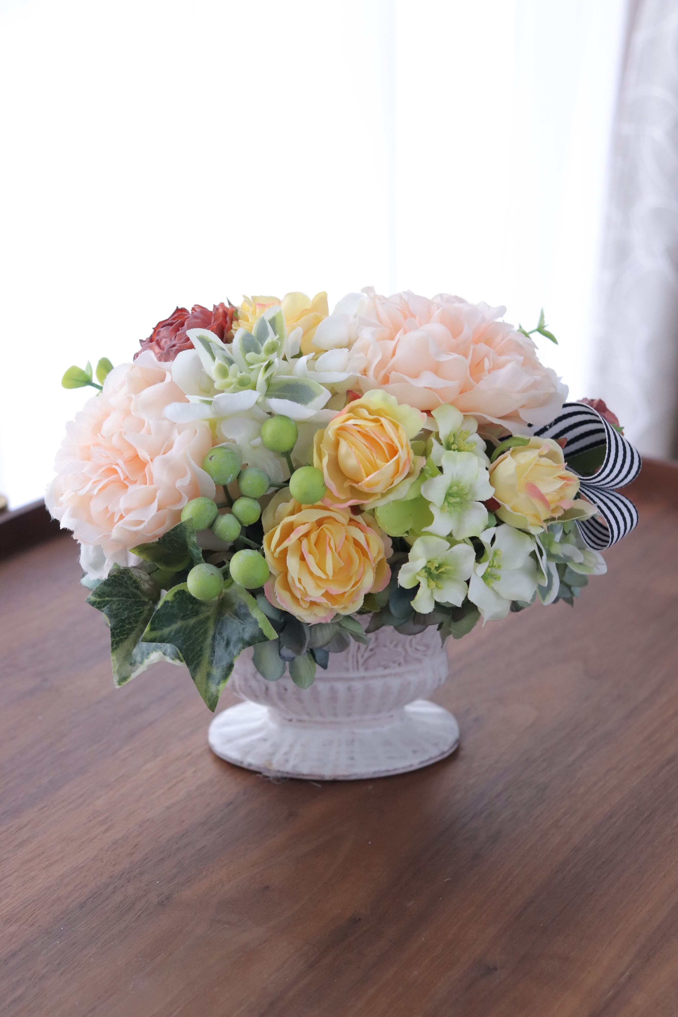 イエローのミニローズ、アプリコットのラナンキュラスで可愛らしく仕上げました。
